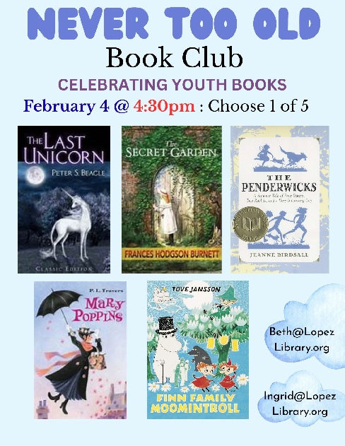 Never Too Old: Celebrating Youth Books meets the 1st WEDNESDAY of the month to enjoy the relevance and diversity of young adult and middle grade books and authors. All ages are welcome. Our next meeting is Wednesday, February 4th at 4:30pm.