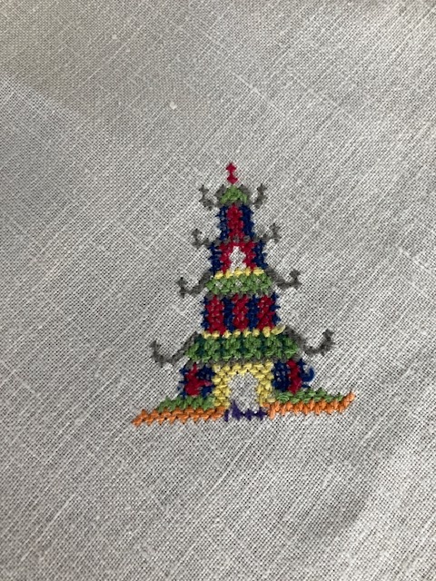 All cotton. Edges of tablecloth and napkins blanket stitched in navy blue. 12 napkins