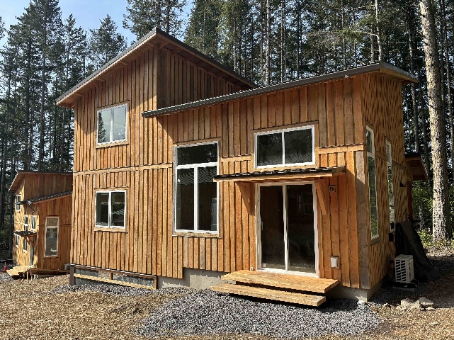 Designed by Vandervort Architects, the energy efficient homes feature island fir siding milled on site, high efficiency windows, heat pump technology, and ZIP paneling. Three homes are single-story, one-bedroom, one-bath 718 square foot, and three are two-story, two-bedroom, two bath 1,163 square foot. Working alongside a skilled group of local carpenters and subs, residents and building partners have provided over 3,787 hours of sweat equity, and volunteers and LCLT construction interns have contributed over 1,219 hours.