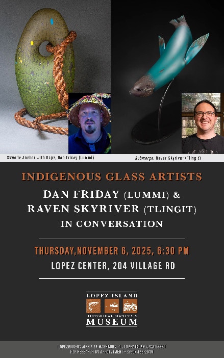 On Thursday, November 6, Lopez Island Historical Society is hosting two amazing events featuring Indigenous glass artists Dan Friday and Raven Skyriver. Details below